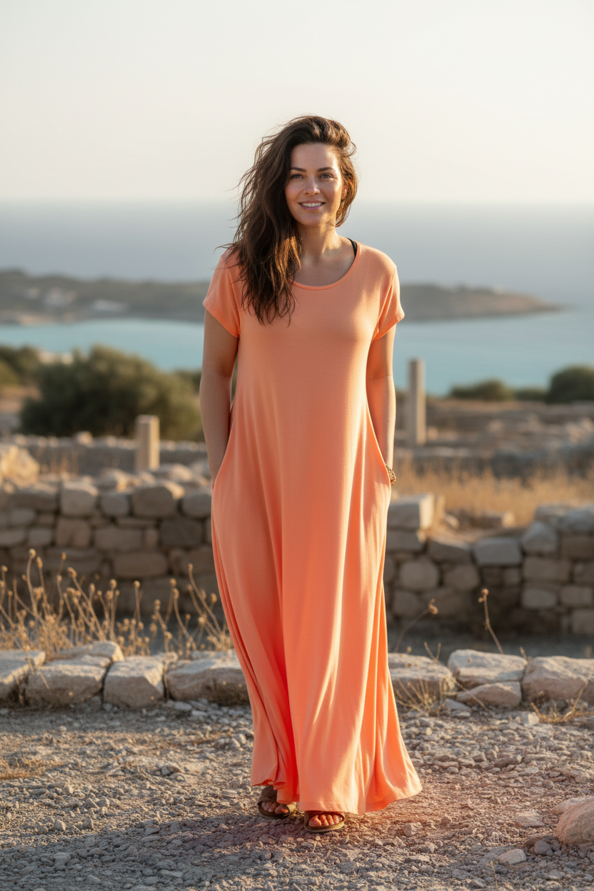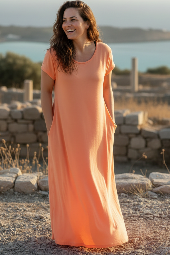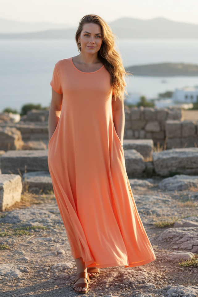 Denne kjole er lavet i blød og smidig viskose, som giver en strækbar pasform, der omfavner kroppen uden at være stram. Med sine praktiske sidelommer og generøst udskårne design er Ballerina Long Dress lige så behagelig som den er stilfuld.