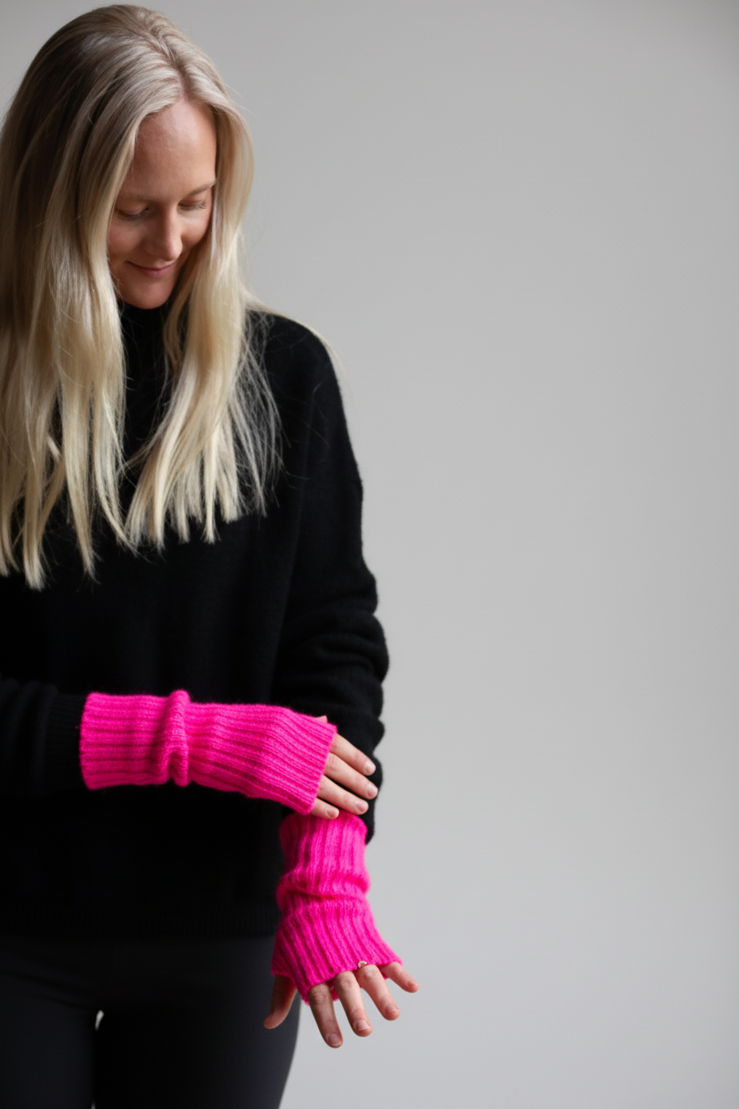 Hedda är de ribbstickade handledsvärmarna som förenar värme, komfort och en lekfull touch av färg. De håller handleder och händer sköna samtidigt som fingrarna är fria – perfekt när du vill vara både varm och rörlig.