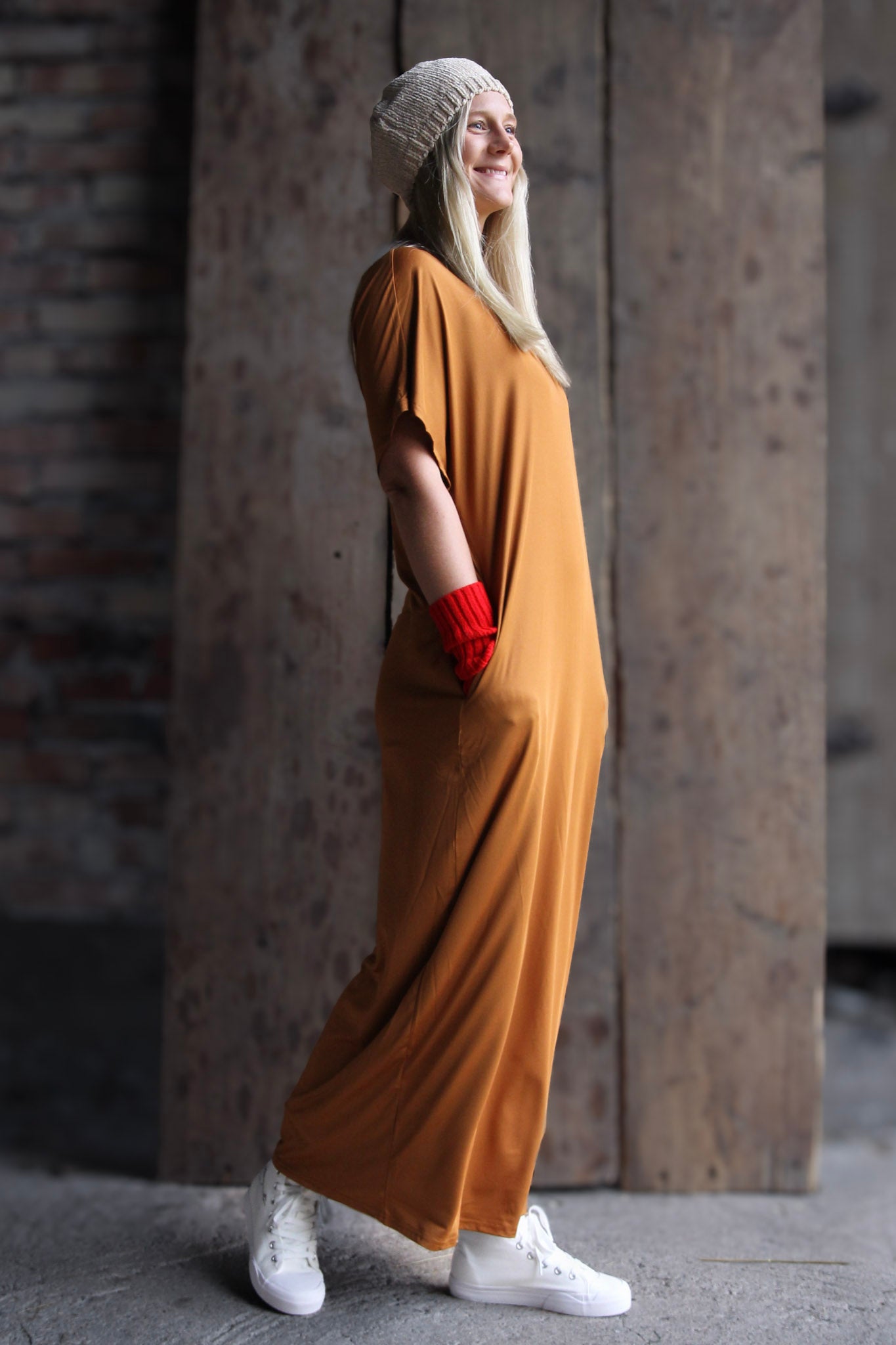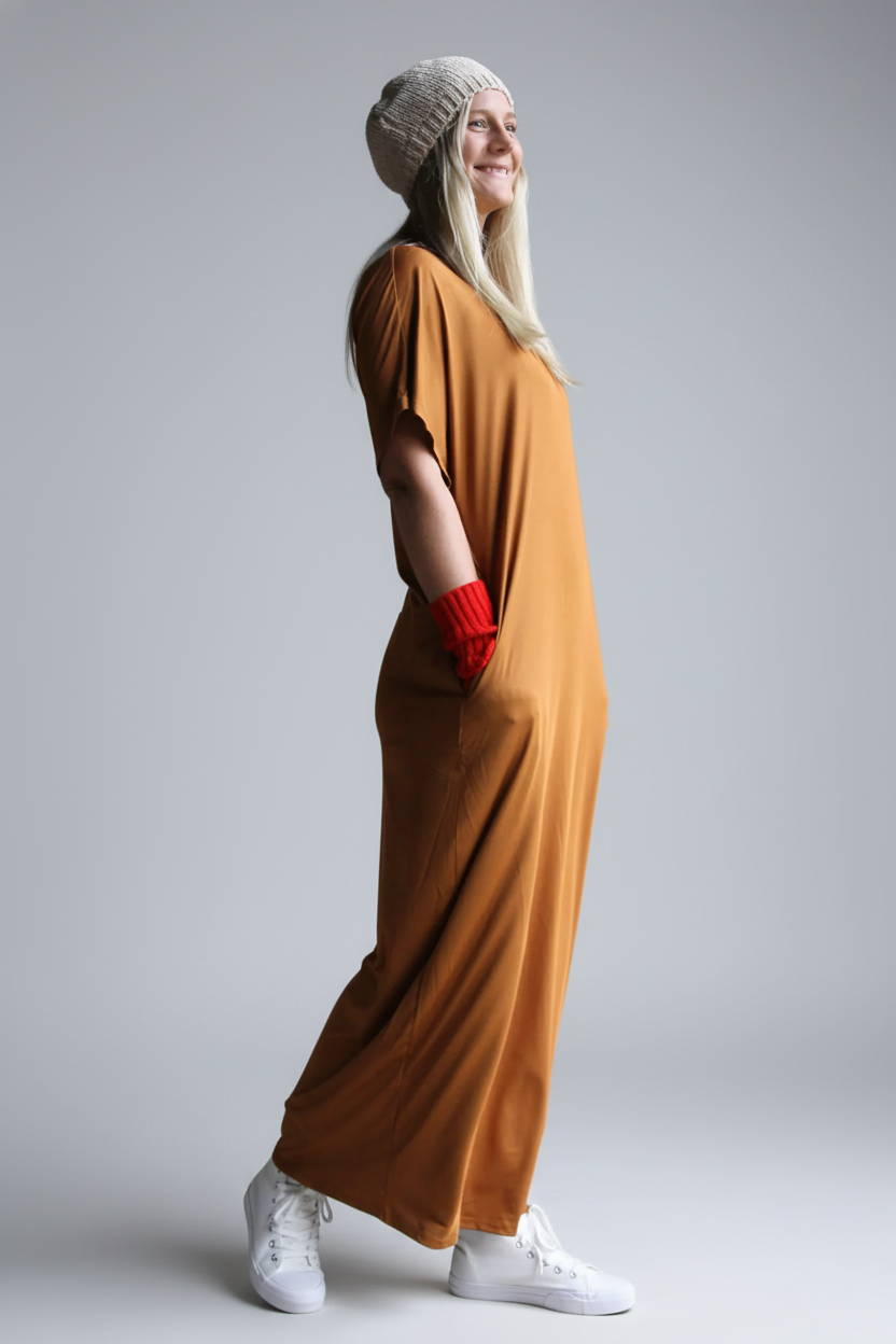 Rostfärgad Klänning Liv Rust – en unik, begränsad testupplaga En lång polysterklänning med praktiska fickor i rostfärgat stuk. Tillverkad i en liten, exklusiv testupplaga och finns i OneSize. Den finns i en robust längd på 135 cm och en bystmåttberedning på ca 116 cm i omkrets. Observera att modellen på bilden är 170 cm lång.