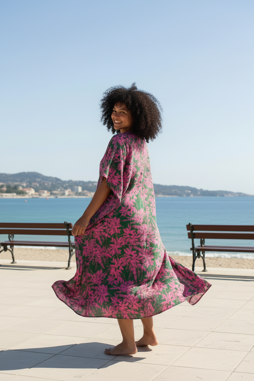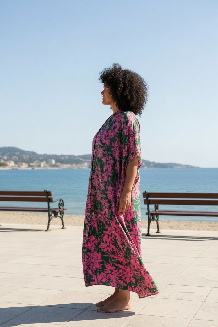 Grün/Rosa Blatt gemustertes Kaftankleid Flower Sea Green Pink
