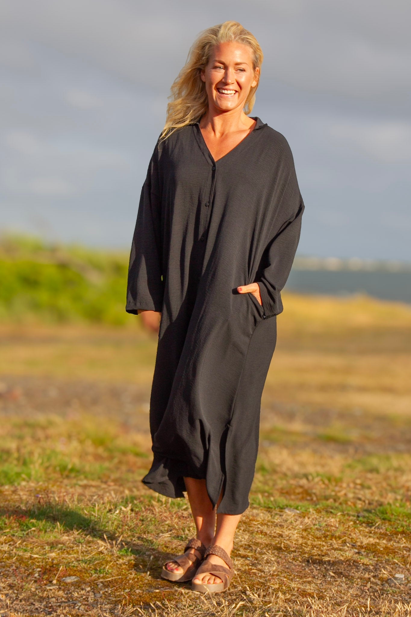 Das langärmelige Kleid Sahara besteht aus 100 % recyceltem Polyester. Dieses Kleid hat lange Ärmel, Knöpfe zum Öffnen vorne und eine großzügige Passform für verschiedene Körpertypen. Mit praktischen Taschen vereint es Stil und Funktionalität.