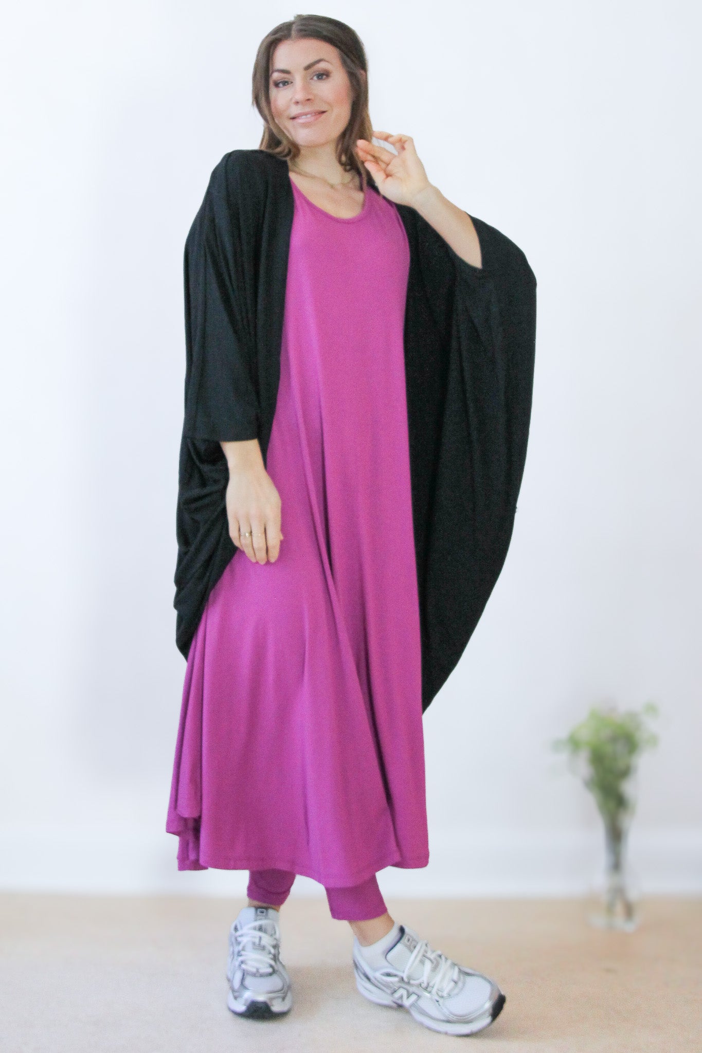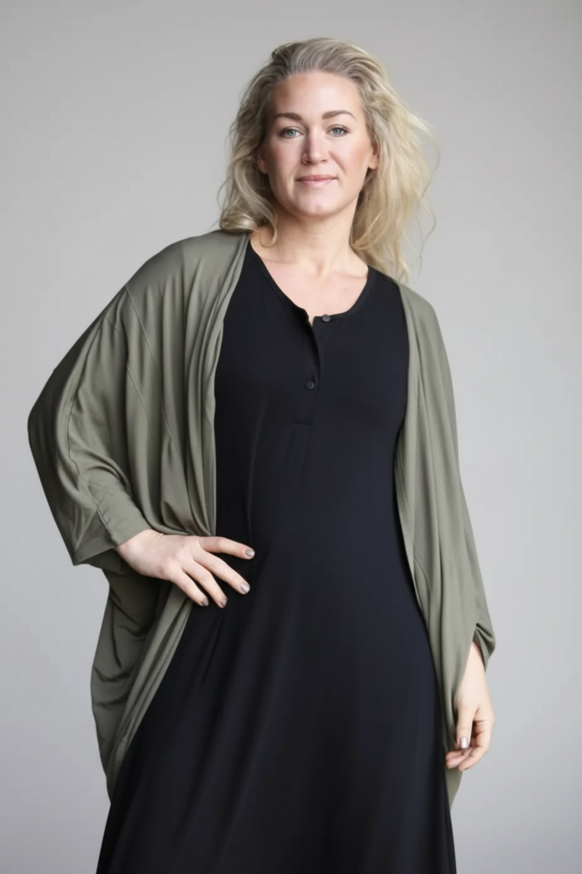 Dieser offene Kimono hat ein stilvolles Design, das einen eleganten und entspannten Look verleiht. Mit abgerundetem Rücken und weiten 3/4-Ärmeln bietet es sowohl Stil als auch Komfort.