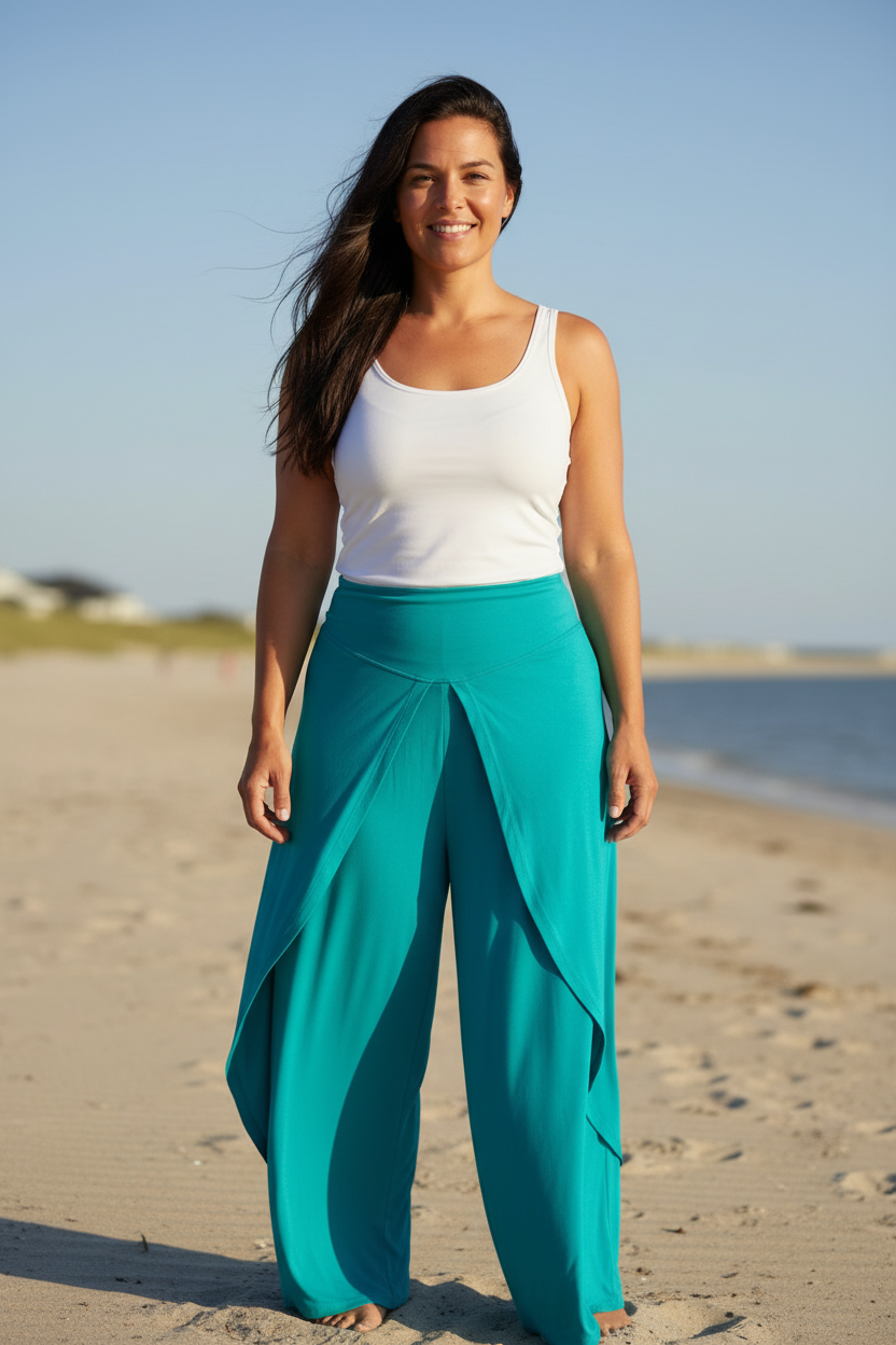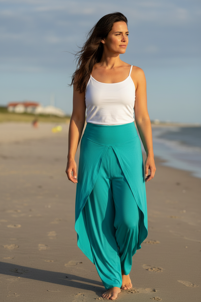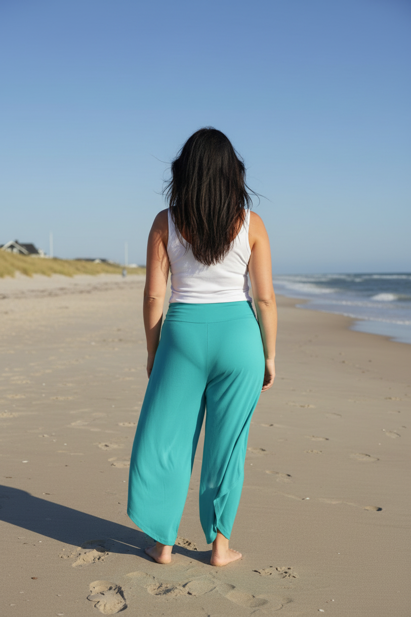 Elegant och sval byxa i silkesmjuk viskos. Lager av tyg och midjan har bred mudd framtill och resår baktill.