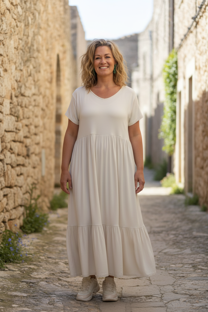En härlig klänning i superstretchigt material och supergenerös design. Vi skulle vilja påstå att den passar alla. Draperad och med otroligt vackert fall!