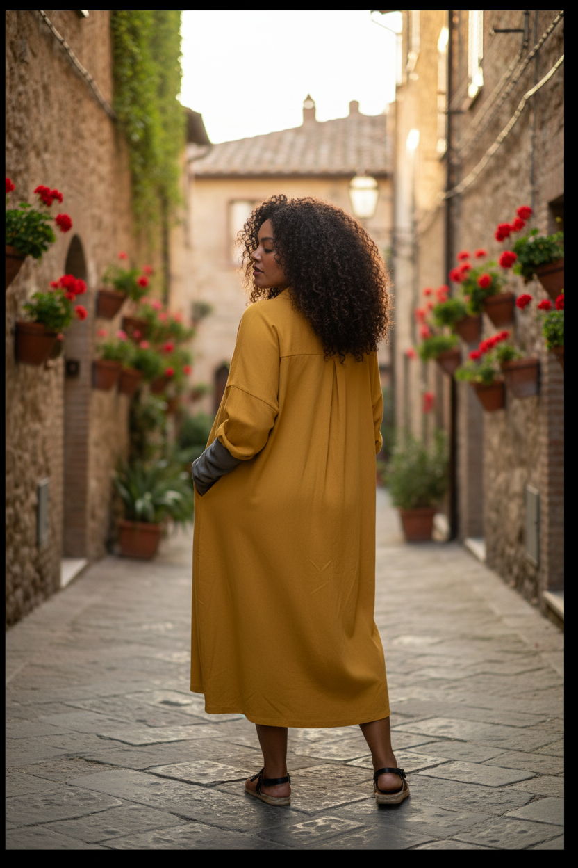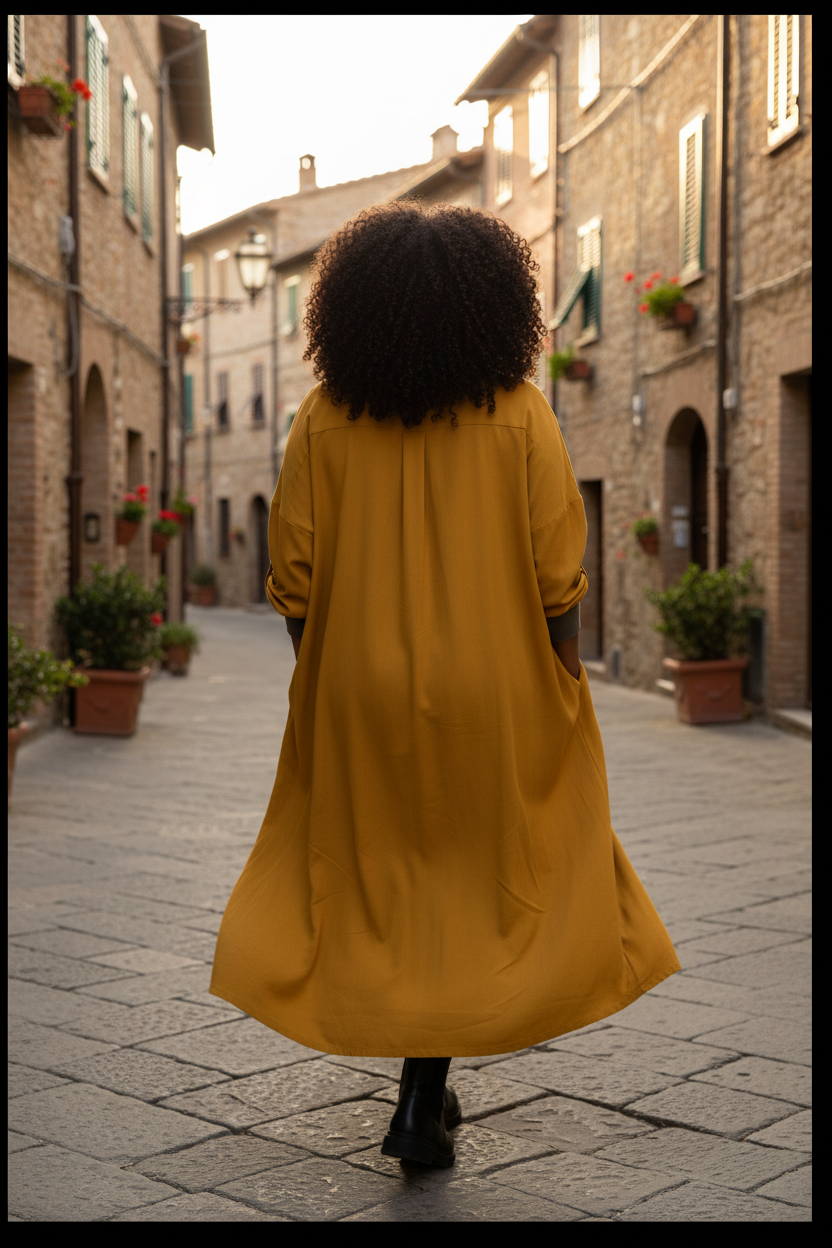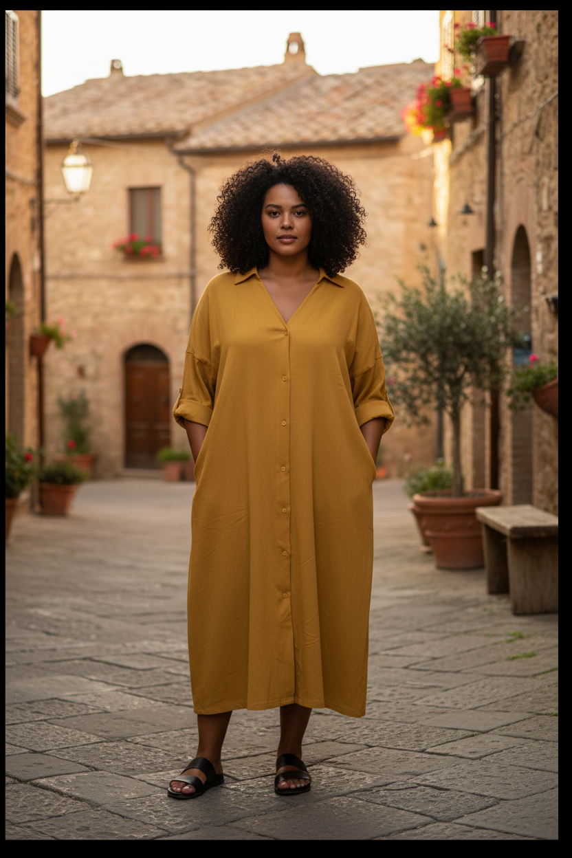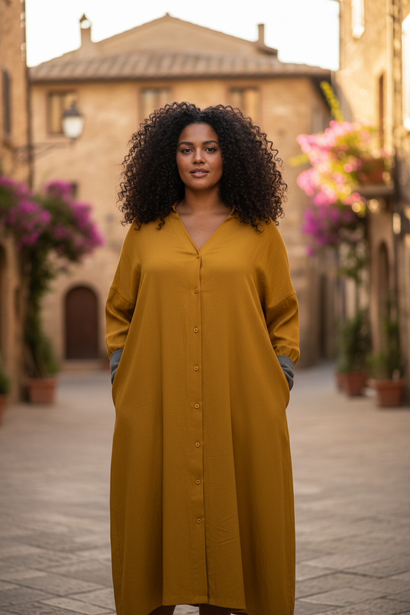 Sahara COTTON är klänning som är designad i klassisk A-modell med modern funktion så som fickor. Den har knappar hela vägen ned, vilket gör det enkelt att bära den både stängd och användas som en klänning eller öppen som en luftig överdel.
