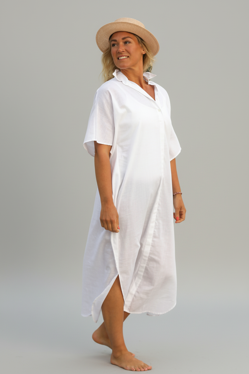 Lofoten Shirt er en lang, deilig skjortekjole i 100% lin med en fin drapering, knapper foran og et herlig luftig design. Vi tror du vil elske det! Linkjolen i kaftan-aktig stil har skjortekrage med kort stolpe, vide, deilige ermer og avrundet kant med splitt på begge sider.