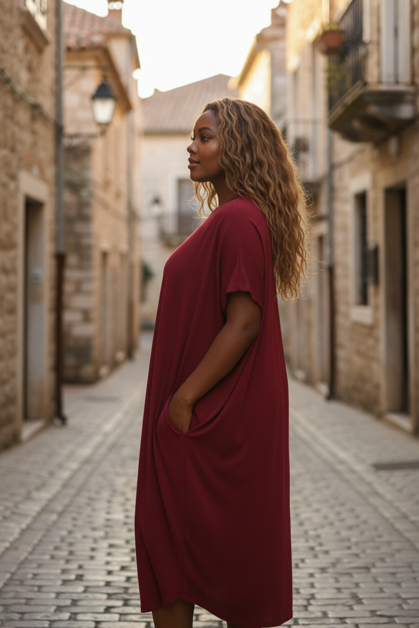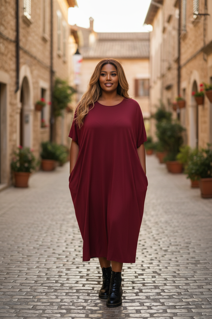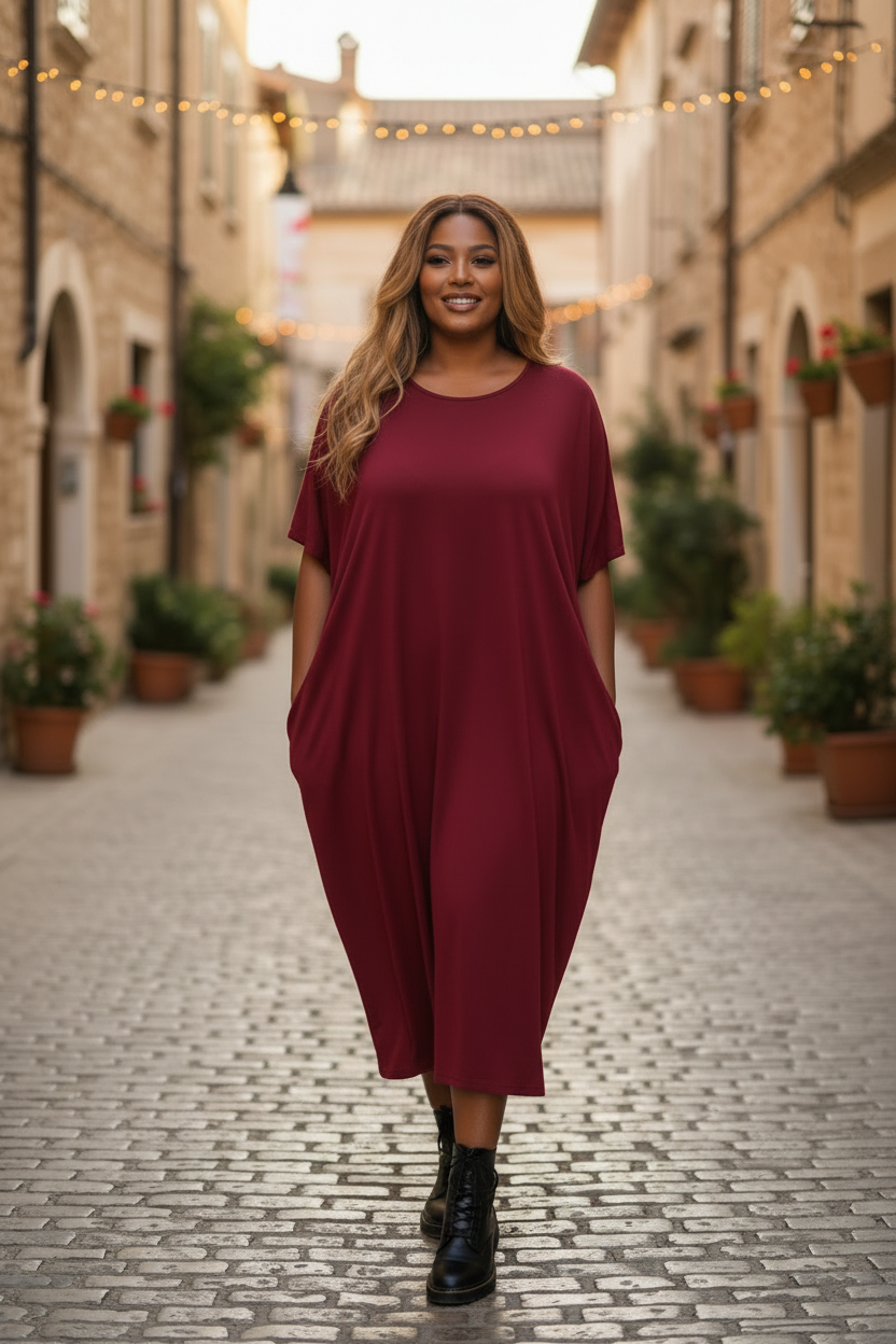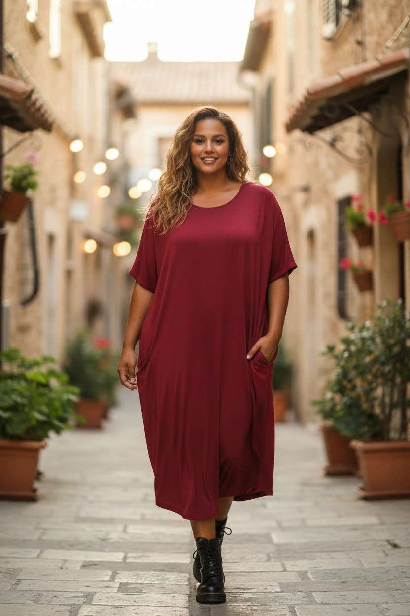 Denna eleganta och bekväma klänning passar både till vardags och festliga tillfällen. Tillverkad av ett mjukt, sval och superstrechig viscose. Den ger en skön känsla mot huden och en smidig passform. Modellen är one size, vilket gör den flexibel och lätt att använda för olika kroppstyper.