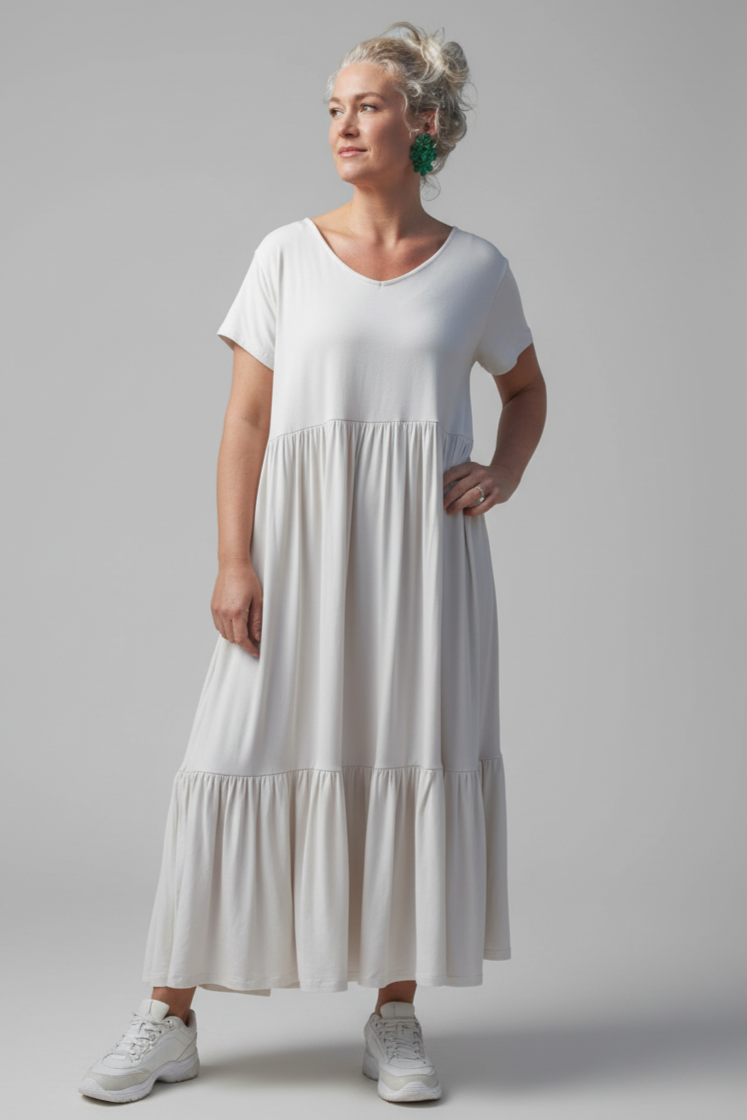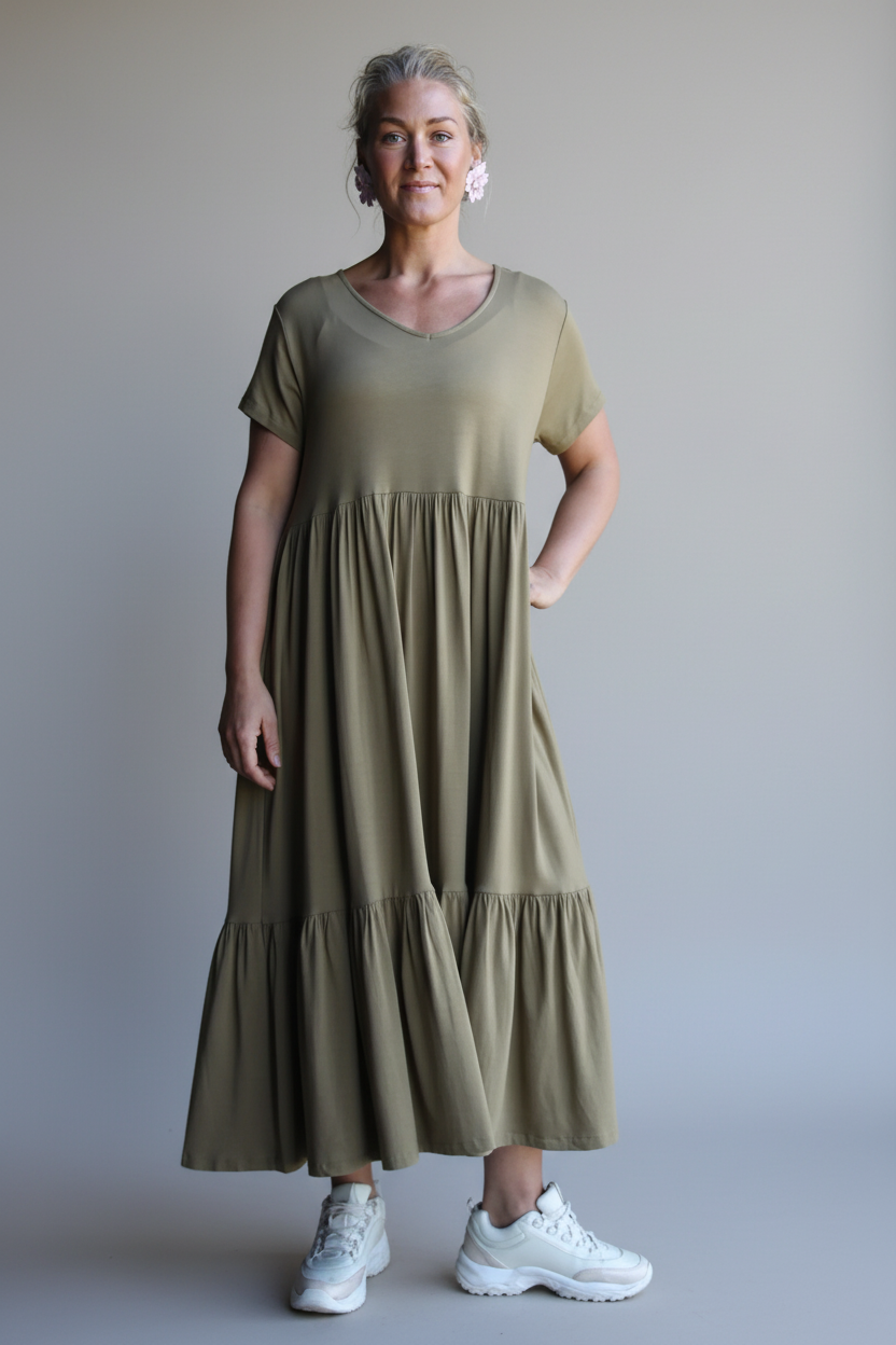 En härlig klänning i superstretchigt material och supergenerös design. Vi skulle vilja påstå att den passar alla. Draperad och med otroligt vackert fall!