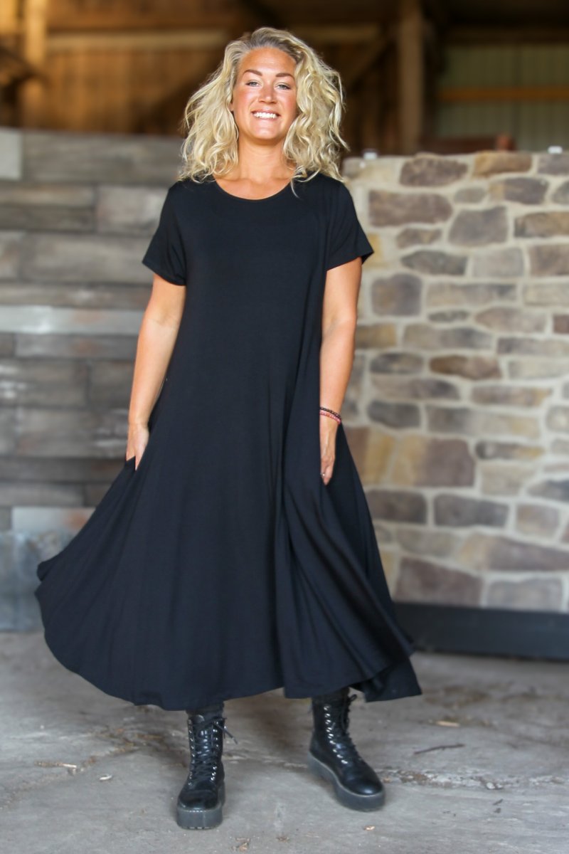 Ballerina Dress är en av våra mest populära klänningar. Med otrolig stretch passar klänningen de flesta kroppstyper och är mycket bekväm att bära. Tyget har en härlig tyngd vilket gör att klänningen faller vackert. Med fickor och en perfekt längd är detta den perfekta klänningen för många olika tillfällen.