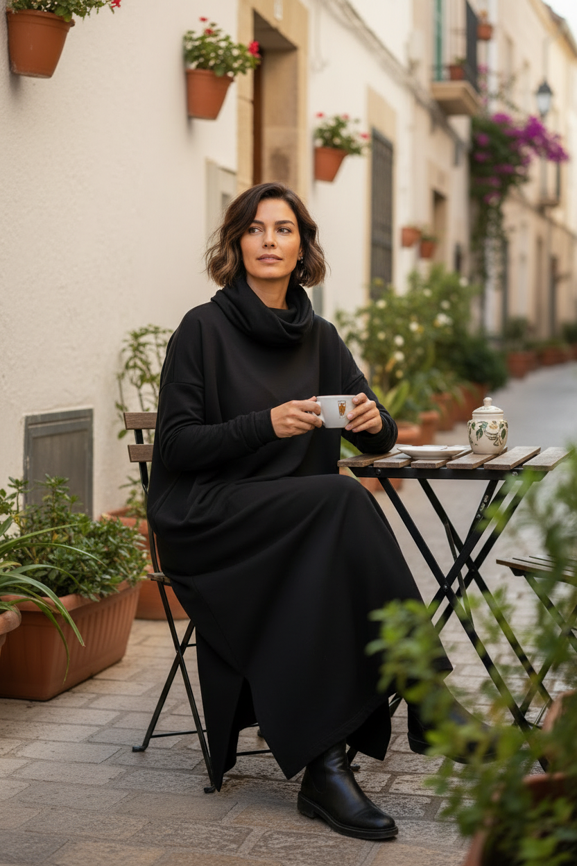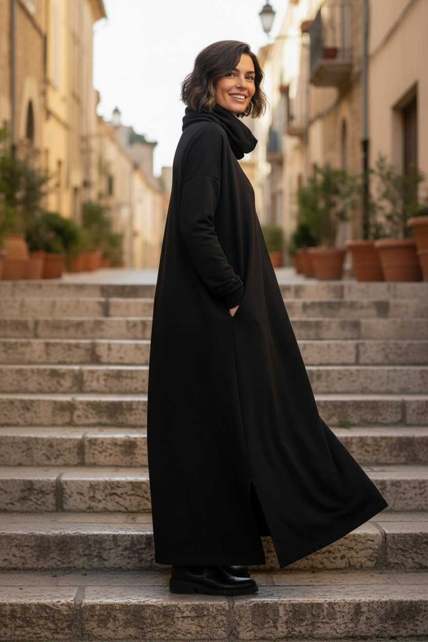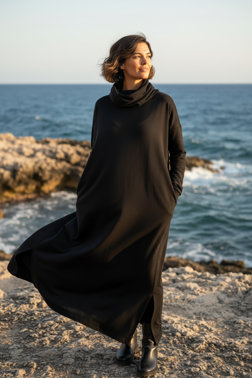 Suveränt snygg och bekväm långklänning med härlig polokrage. Polo Kaftan Dress är en av våra stora favoriter! Nu kommer denna sköna poloklänning i en mjuk och stretchig ekologisk bomull. Klänningen har en avslappnad passform med en lös och ledig polokrage och långa ärmar. Naturligtvis är den försedd med fickor!