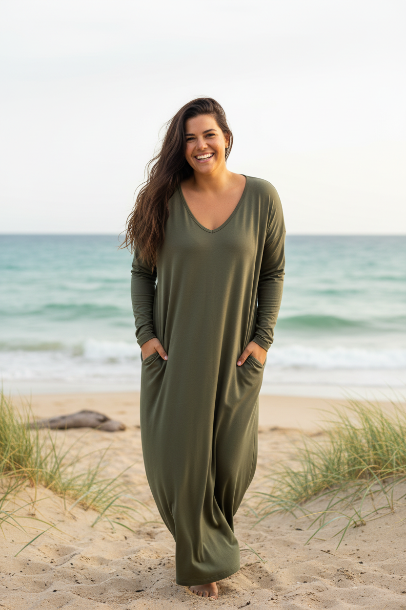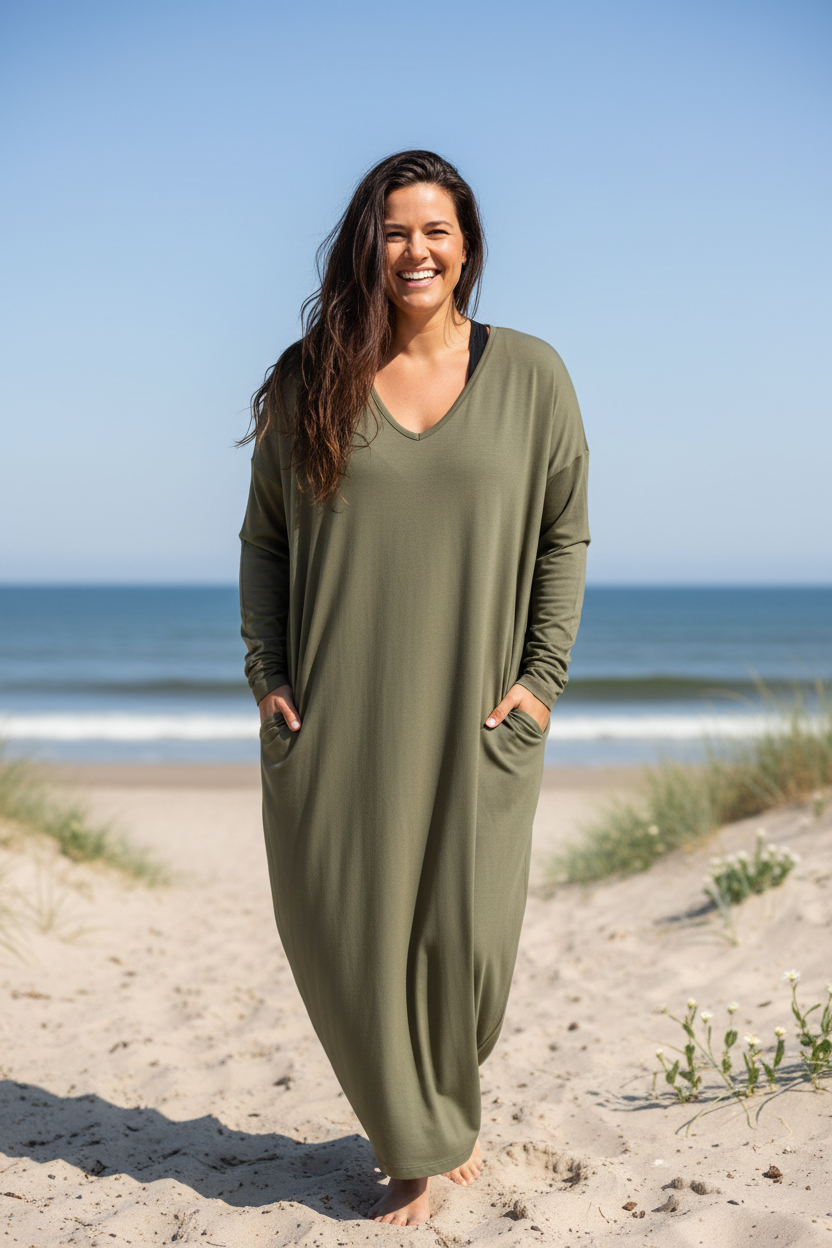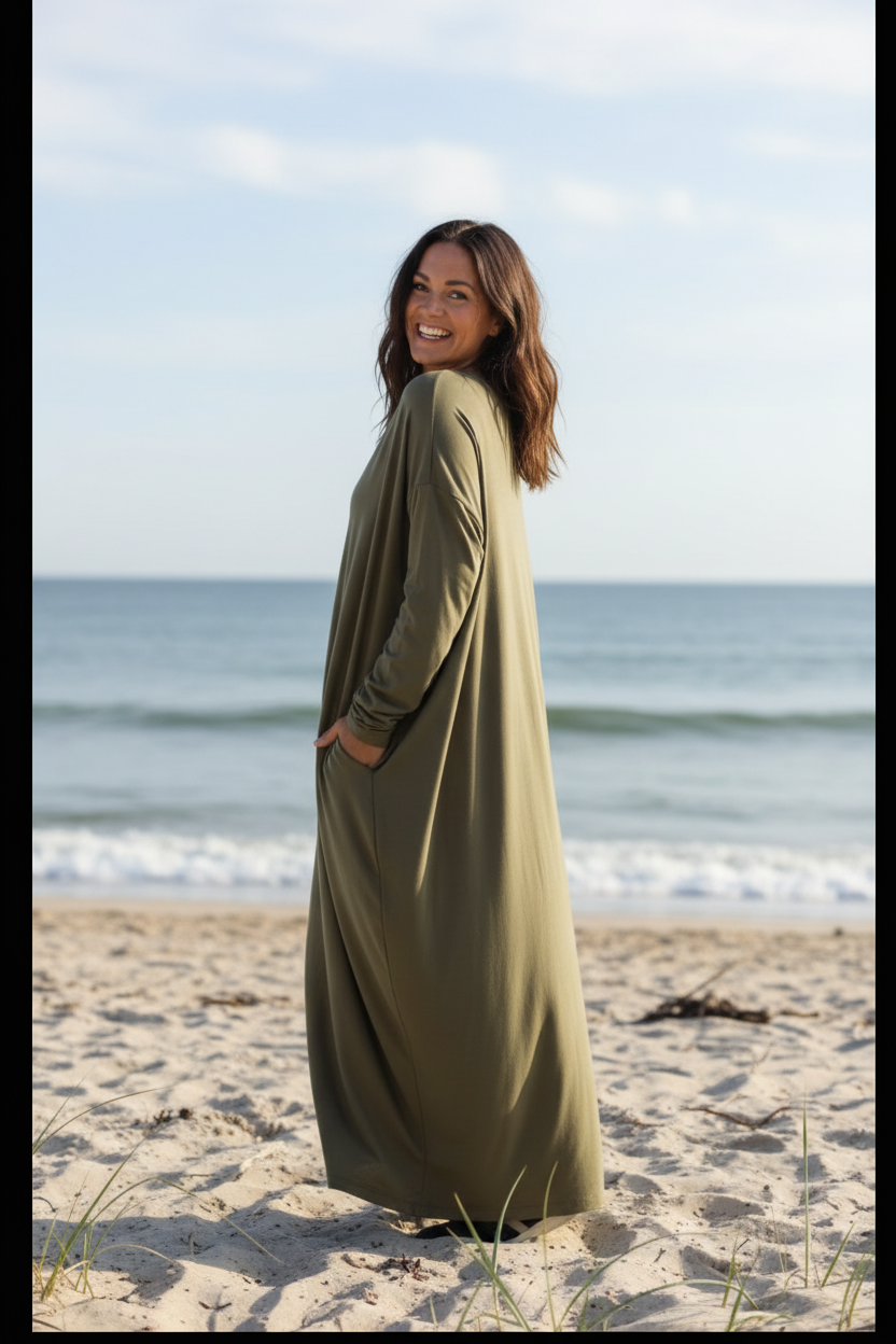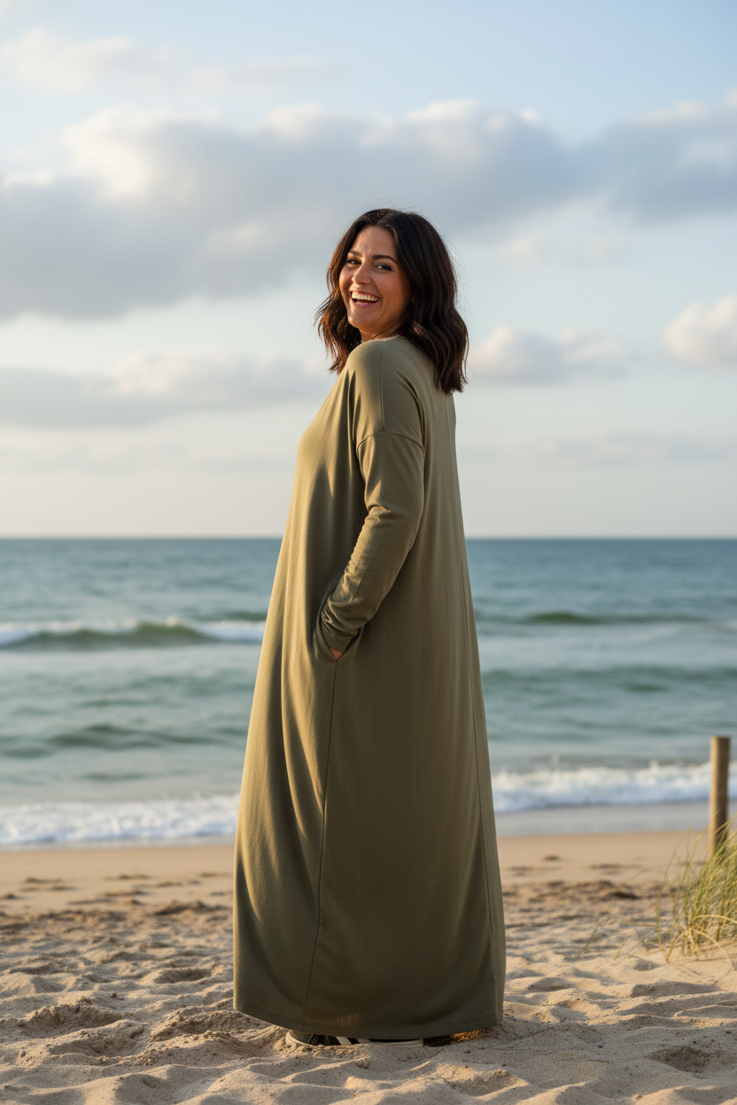 Möt Klänningen Linn, det är din klänning om du gillar stil och komfort. Denna klänning både mjuk och följsam, vilket gör den idealisk för alla tillfällen. Generös design och i två storlekar One-Size och One-Size+.